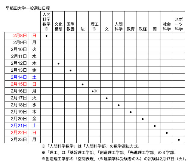 「早稲田大学 学部入学案内」の「一般選抜」の情報をもとに、学部と一般選抜の試験実施日を組み合わせた一覧表を作成しましたので、参考にしてください。