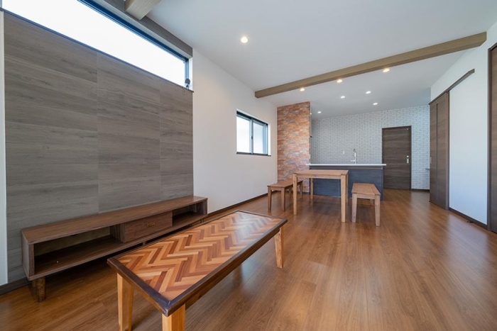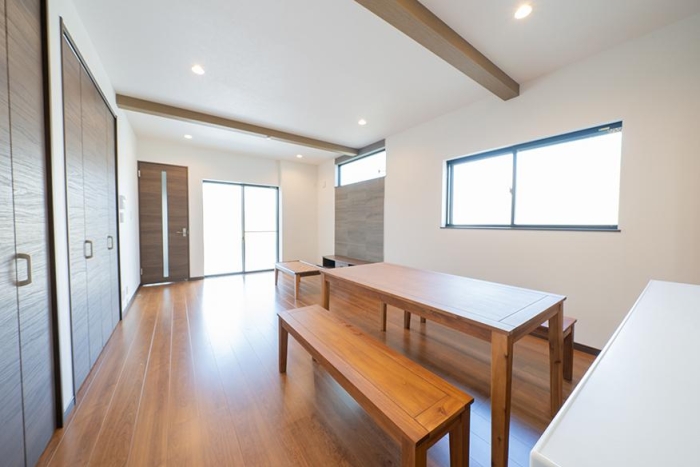 リビングには柔らかな光が入り、食卓やリビングにぬくもり溢れる団らんの空間。アクセントクロスを取り入れ茶色が基調のLDKを含めた空間全体のカラーバランスを保っています。