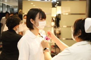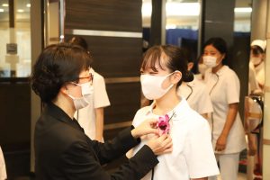 ↑先生からコサージュを付けてもらい、これから戴帽式に臨む1年生たち。