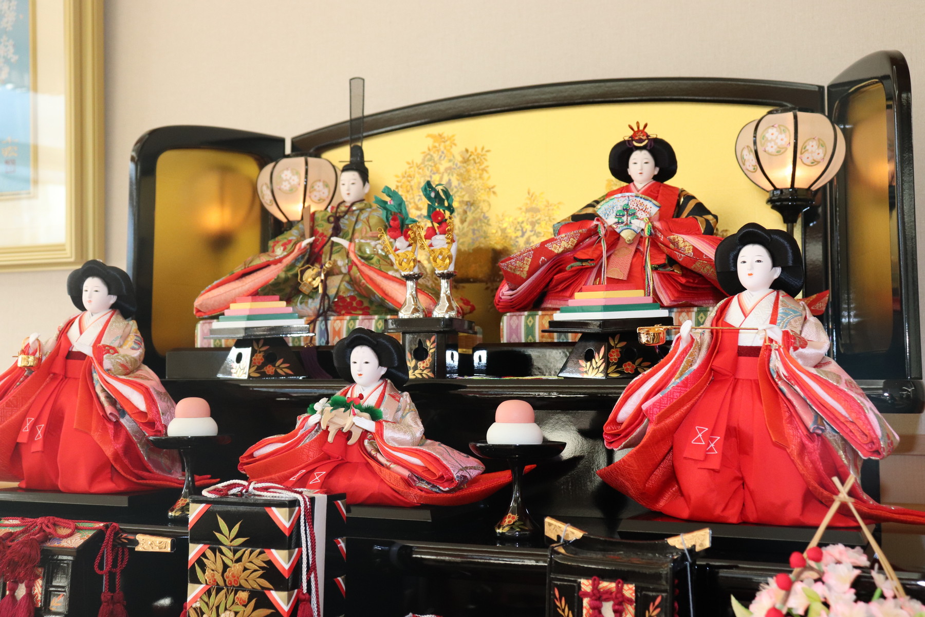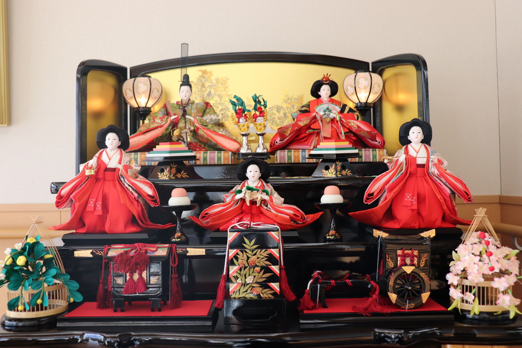 こちらは七段のお雛様と違って黒塗り台になっておりますので雰囲気が大きく変わりますね☆゚+.