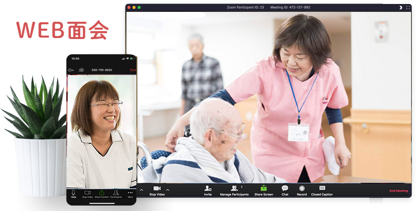 新型コロナウイルス感染予防策より、ご入居者の外出制限、外部からの来訪制限を行っている中、ご入居者様とご家族様がお顔を合わせてお話しが出来ない事への不安や寂しさの……
